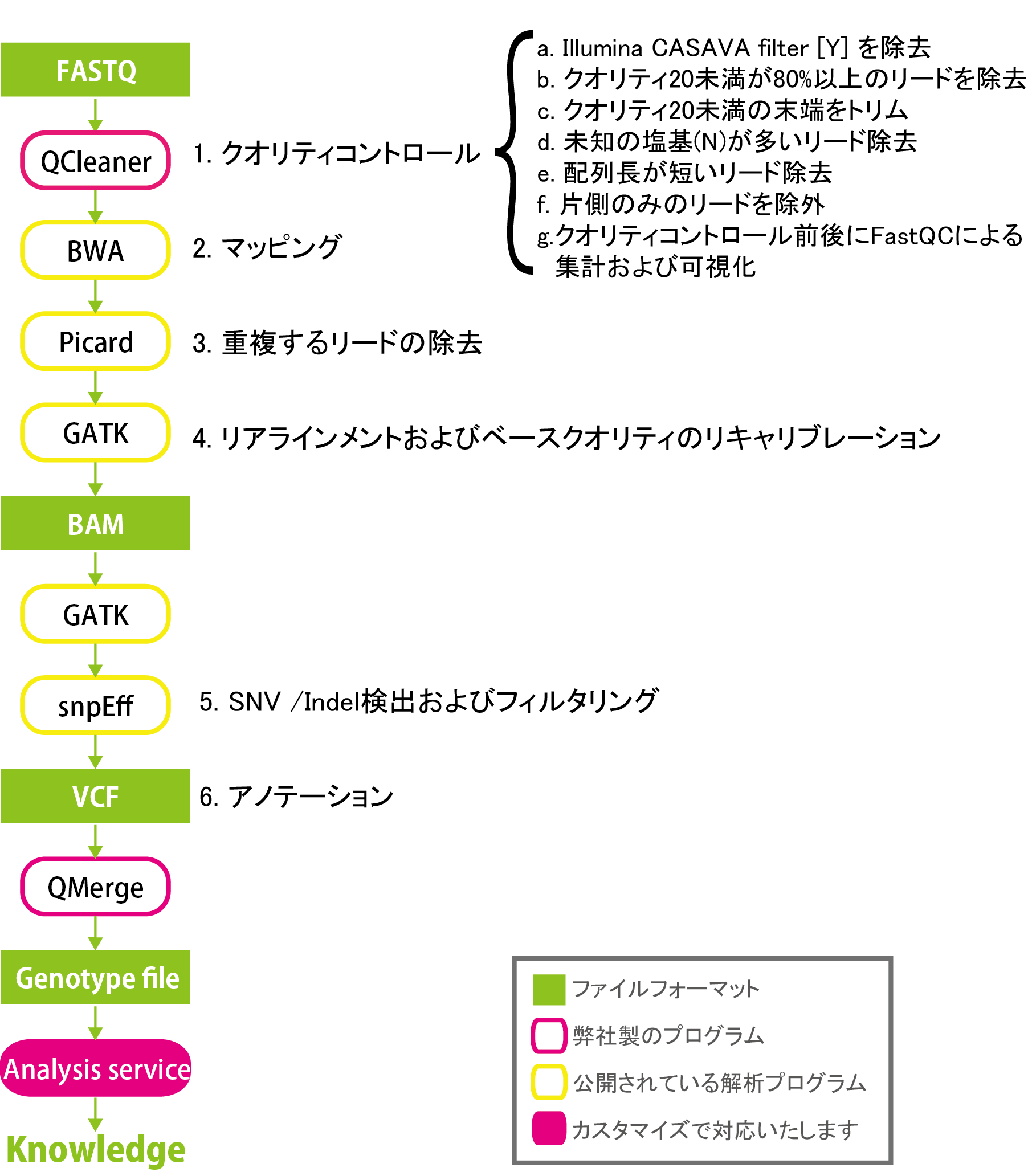 次世代シーケンサ(NGS; Next-Generation Sequencing)によるゲノムシーケンス結果からゲノム上の変異を検出します。
